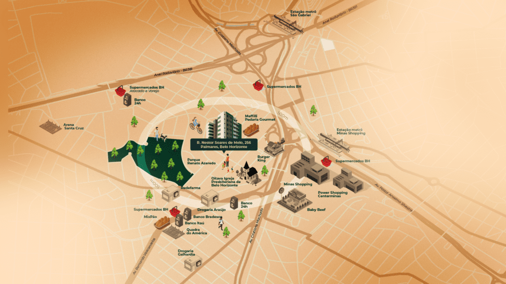 Em sua localização na grande BH, o bairro Palmares faz vizinhança com diversos pontos de conveniências, shoppings, supermercados, padarias, drogarias, restaurantes, parques e academias.
